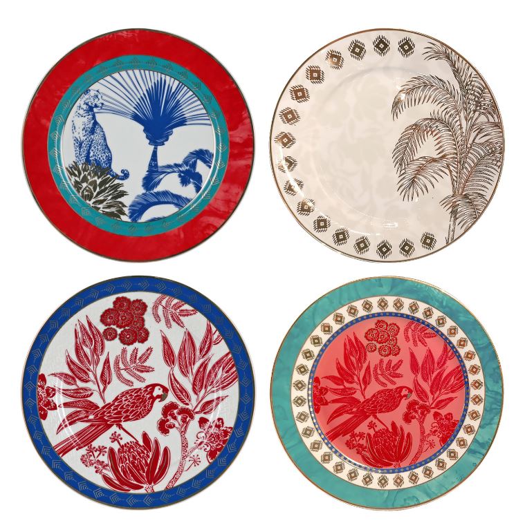 Zengin ve Estetik Tasarım: Set; kırmızı, turkuaz, lacivert ve bej tonlarındaki canlı çerçevelerle sarmalanmış 4 farklı tropikal desenden oluşmaktadır.